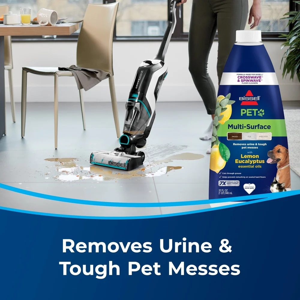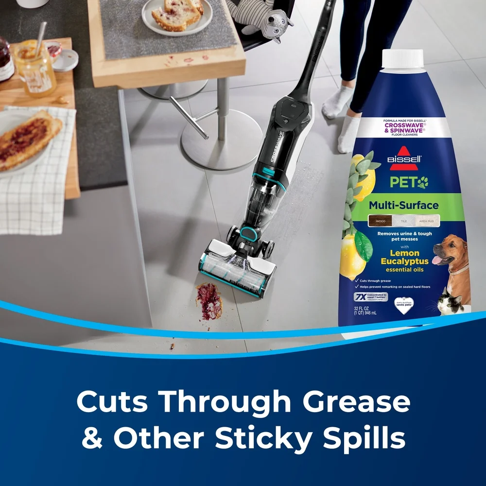 ® PET Multi-Surface formula is a cleaning solution designed for use in our innovative CrossWave® wet dry vacs that vacuum and wash at the same time, and our SpinWave® hard floor powered spin mops. It's also safe for use in JetScrub™ Pet carpet cleaner when used with the hard floor attachment. This powerful cleaning formula provides an all-in-one option to clean both sealed hard floors and area rugs*. It is specially formulated to cut through tough kitchen grease and help prevent pet remarking on sealed hard floors. ® PET Multi-Surface formula removes urine & tough pet messes, as well as dirt, tracked-in mud and stuck-on messes on hard floors. All this formula leaves behind is a fresh lemon-eucalyptus scent and virtually streak-free floors. Plus, it’s safe to use around kids and pets when used as directed. And this formula doesn’t just clean up after pets, it helps save them! proudly supports Pet Foundation® and its mission to help save homeless pets. When you buy a ® product, you help save pets, too. We’re proud to design products that help make pet messes, odors and pet homelessness disappear. *Area rugs for CrossWave® machines only.